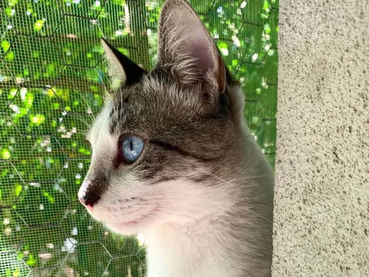 Gato macho, de pelagem curta na cor branca com marrom, olhos azuis claro. Ele apareceu bebê no meu terreno e alimentávamos ele, resolvi castrar para diminuir a quantidade de gatos que aparecem por aqui, e diminuir as brigas, mas ele acabou se tornando uma gato muito medroso, ele não chega a ser arisco, mas é muito medroso, pode riçar para estranhos, mas nunca atacou ninguém. Ele gosta de carinho, mas não se adaptou a deitar no colo, porém é uma ótima companhia na cama ou sofá, gosta de ser penteado, tem preferência de comer ração em potes rasos ou prato mesmo, usa caixa de areia normalmente.