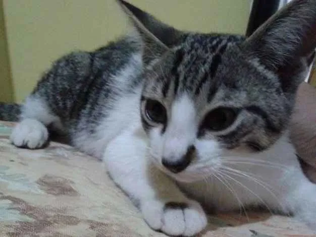 gato de pelagem branca branco e preta de olhos verdes, puxadinho.