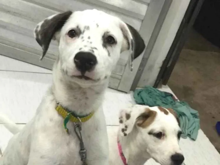 São duas cachorras , uma sendo mas agitada e outra mas queria , uma branca com manchas preta e outra branca com manchas marrom, infelizmente os vizinhos não estão gostando muito