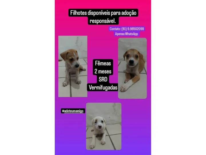 Resgatei uma cadela de rua e não sabia que estava esperando neném, nasceram bem,graças a Deus. Estou com 3 fêmeas para adoção, duas marrom com branco, pelo liso e uma toda branca,peluda, com detalhes ao redor dos olhos marrom e preto. Infelizmente não tenho condições de ficar com elas. Sou de Olinda-PE.