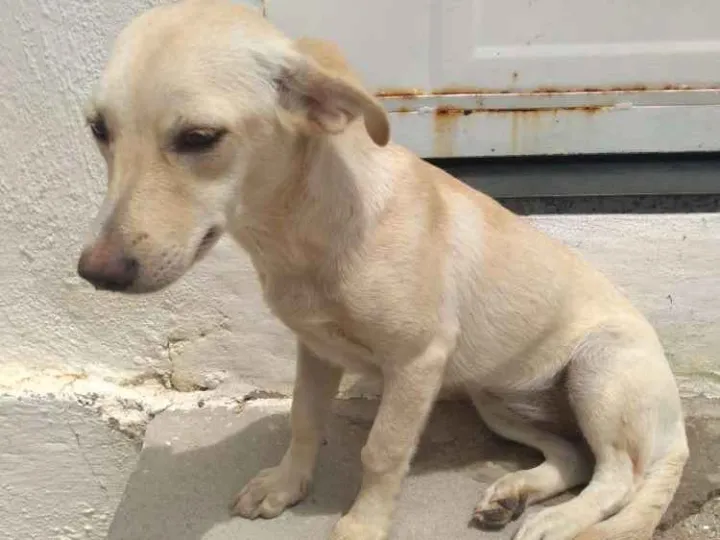 E branquinha tem orelhas grandes parece uma salchisa os pelos brancos liso e tem patas grandes