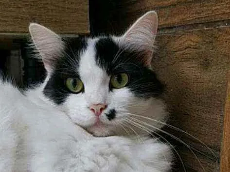 Branca com preto, tem uma pinta no fucinho.