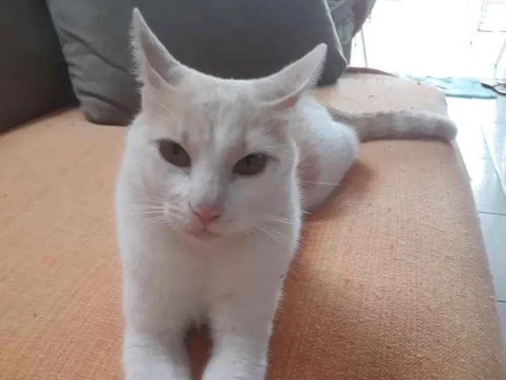 Ele é mansinho, dócil é pequeno não cresceu.Ele é branco com manchinhas pelo corpo de amarelo. Ele não tem costume de rua deve está muito assustado. Foi visto nas câmaras da rua que ele estava sujo de lama.
