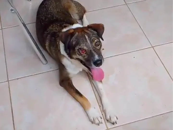 A cadela Vitória foi vítima de bandidos, que a esfaqueou no olho, e logo após ela foi abandonada pelos donos. Foi socorrida por uma senhora, e Vitória hoje é castrada, não tem sequelas não visão. Mas precisa ser adotada