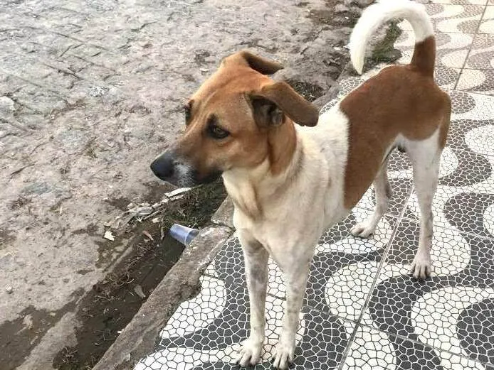 Este animal apareceu na quinta com corrente muito apertada e muito provavelmente foi abandonado aqui mesmo, pois os vizinhos não conhecem o animal e nunca viram, esta muito magrinho mas estou alimentando, porém ele esta muito triste, gostaria de conseguir uma adoção para ele