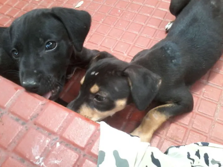 2 cadelinhas que foram jogadas na minha casa. Não tenho como ficar, estou desempregada, já tenho mais de 20 gatos. Elas estão na frente de casa, um terraço aberto, improvisei um abrigo. Tem 15 dias que estão aqui. Uma delas está perdendo peso,não se alimenta bem, ficou desidratada, estou dando soro. Preciso encontrar um lar decente para elas.
