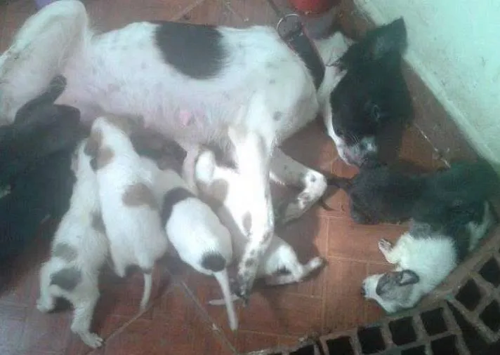 a mãe é mestiça: vira-lata com outra raça.todos os filhotes são lindos tem 1 mês de vida.tenho nas cores marrom,preto com marrom,preto,preto com branco,marrom com branco.