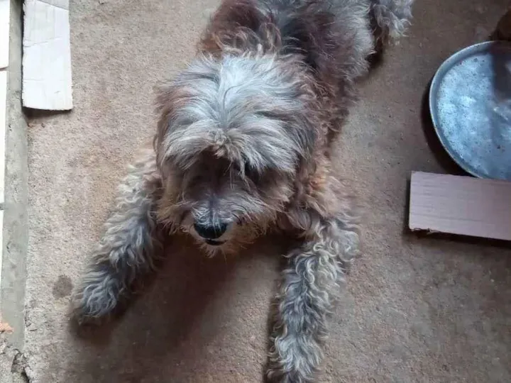 Cão peludo cinza escuro. Médio porte. Apareceu durante as festas juninas assustado com os fogos. Dócil. Não posso cuidar. Já tenho um cão. Caso seja o dono me ligue para buscar seu cão. Está preso na corrente com água e comida. Não tenho tempo de cuidar. Caso queria adotar me ligue para ir buscar.