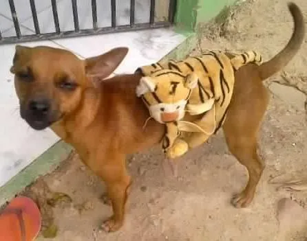 ANIMAL PEQUENO, DA RAÇA MINIATURA PINSCHER MISTURADO COM VIRA LATA, DE COR MARROM MEIO ALARANJADO, NO PEITORAL TEM UMA MANCHINHA BRANCA. TEM O FOCINHO ESCURO, TEM A PONTINHA BRANCA DA PATA ESQUERDA, DOIS BURAQUINHOS COMO SE FOSSEM REDEMOINHOS NA BUNDINHA DELE, AO REDOR DOS OLHOS É PRETO, COMO SE FOSSE PINTADO COM LÁPIS DE OLHO.