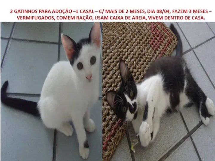 Agora são só 2 gatinhos - com mais de 2 meses - já comem ração, tomam leite, bebem água e usam caixa de areia (todos)...já estão vermifugados e vivem dentro de casa.