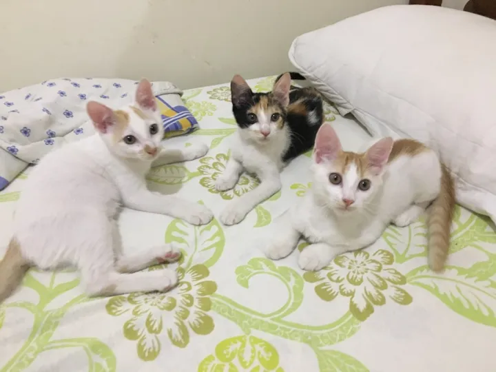 Esses três filhotinhos fofíneos precisam de um lar. Os branquinhos com bege são machos e a com manchinhas preta é fêmea. Eles têm 2 meses, comem ração durinha e usam a caixinha de areia. São bem amorosos e brincalhões!