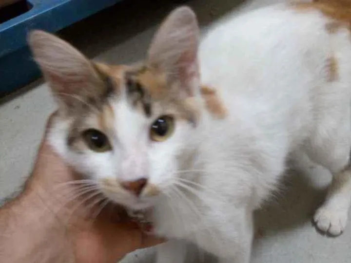 Gatinha branquinha com manchinhas caramelo com preto. Faltam as vacinas. Fiz a castração particular. Essa gatinha apareceu na porta da empresa que trabalho e resolvi alimentá-la. A mesma encontrava-se com feridas, desnutrida e muito suja. Fiz o que de início precisava. Faltando as vacinas. Nao poderei mas ficar com ela por motivos financeiro entre outras responsabilidades e tempo para cuidar.