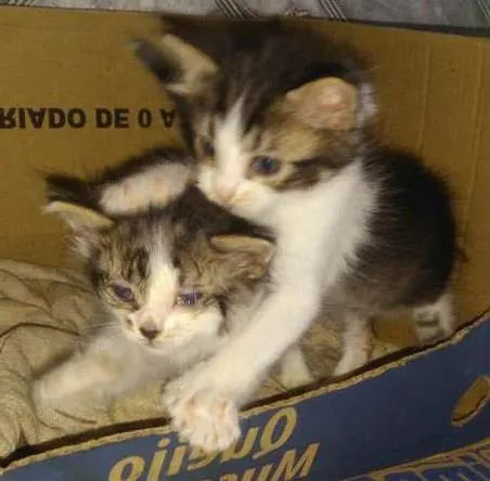 Dois gatinhos, macho e fêmea, com 20 dias de nascidos.