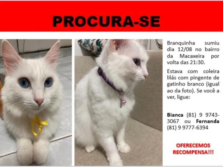 Branquinha desapareceu em 12/8/2022, por volta das 21:00 no bairro da Macaxeira- Recife/ PE estava com coleira lilás com pingente de gatinho branco, possui pelagem branca e olhos azuis. Ofereço recompensa!!