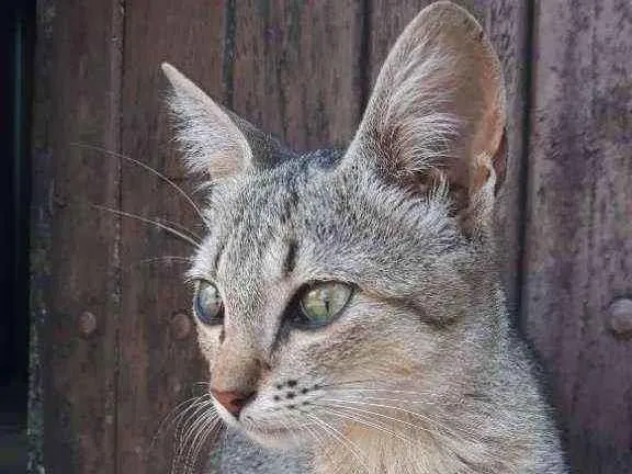 Linda gata, cinza que come comida e ração, em busca de um lar.