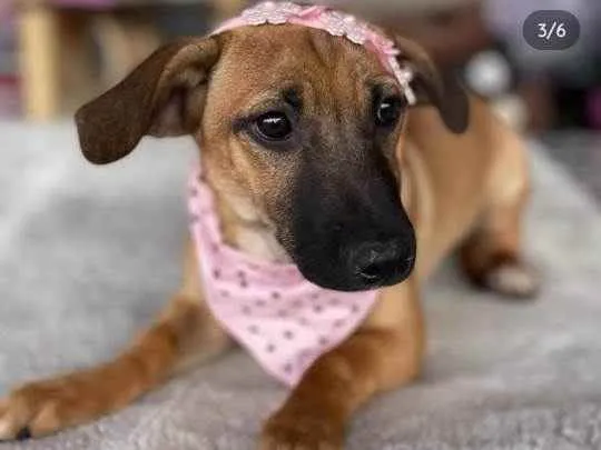 Pelagem curta cor caramelo carinha preta, muito carinhosa