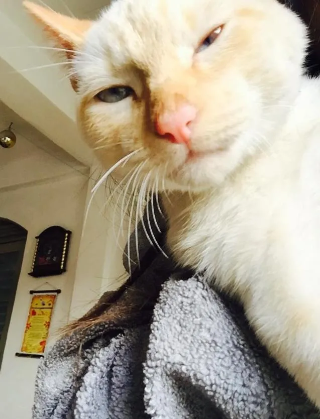 Um gato de olhos azuis, branco com o rabo amarelo claro, o amarelo do rabo é em redondo, a cara é um pouco amarelada e as costas. Perdido em: Almirante Tamandare, PR. Bairro: Parque São Jorge no dia 17/06/2016.