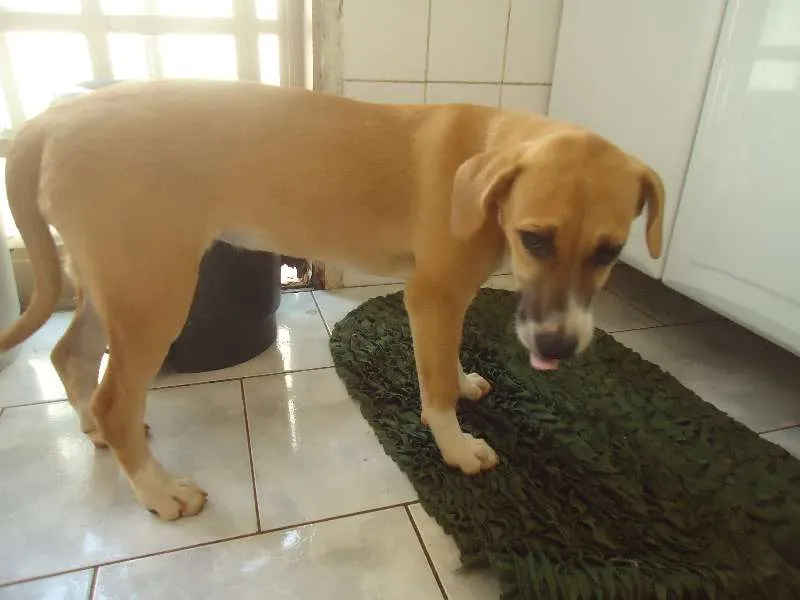 Foi deixada na rua, estou cuidando mas não posso ficar com ela, já tenho um macho e meu quintal é pequeno, ela aparenta ser mestiça de Fila, e parece que vai ficar grande.