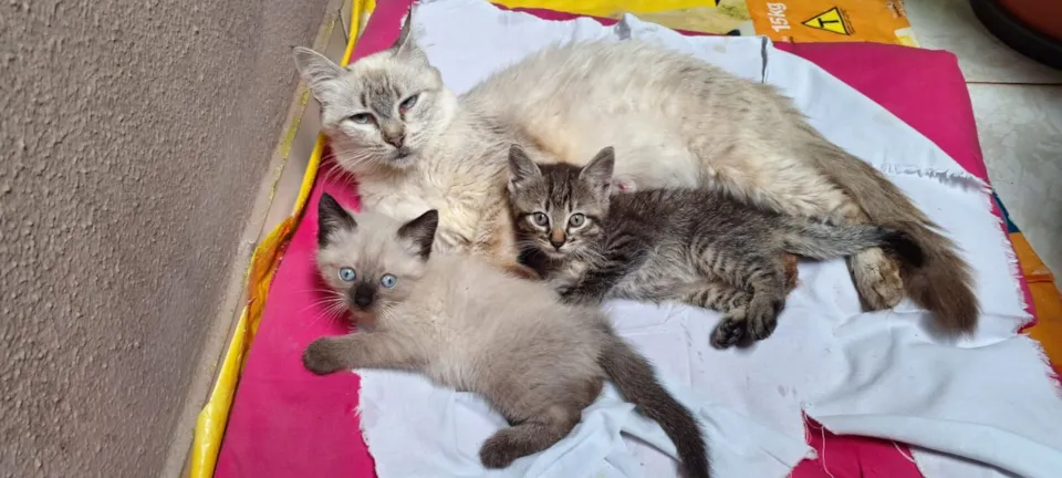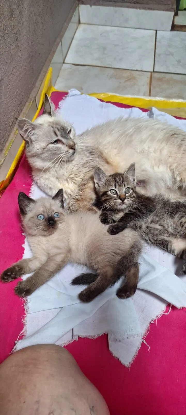 Doa-se família felina, a mãe gata Selena foi resgatada durante inverno de 2025 já prenha, cuidamos dela durante todo o inverno até estar estável e prontos para doação com seus dois filhotinhos que ainda não foram nomeados, uma gatinha fêmea siamêsa do olho azul e um gatinho macho rajado de olho verde, a mãe gata Selena não é castrada e é muito dócil, os filhotinhos ainda não tem 40 dias e já estão comendo ração e são muito brincalhões