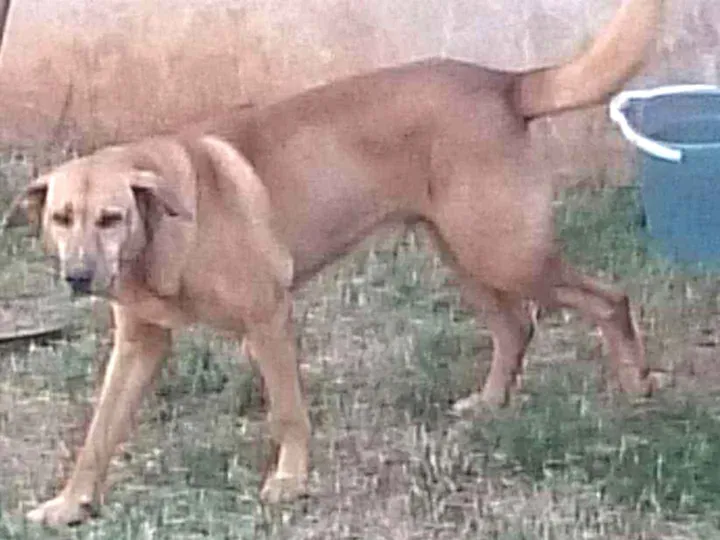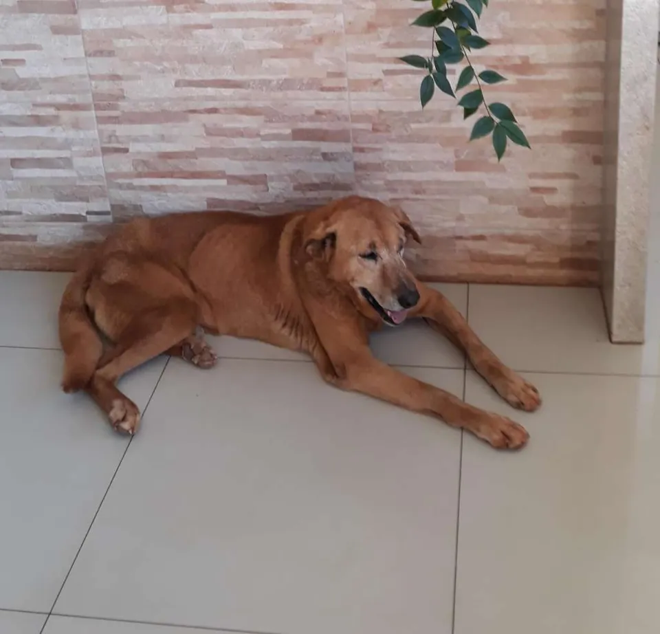 Meu cachorro é marrom claro, e grande e tem mais de 15 anos. Está com as patas de traz um pouco fracas. Tem um rabo grosso e grande, pelagem lisa é bem dócil.