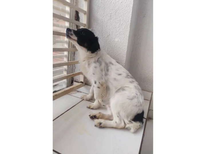 Cachorro com pêlos preto e branco, castrado e vacinado, carinhoso e brincalhão.