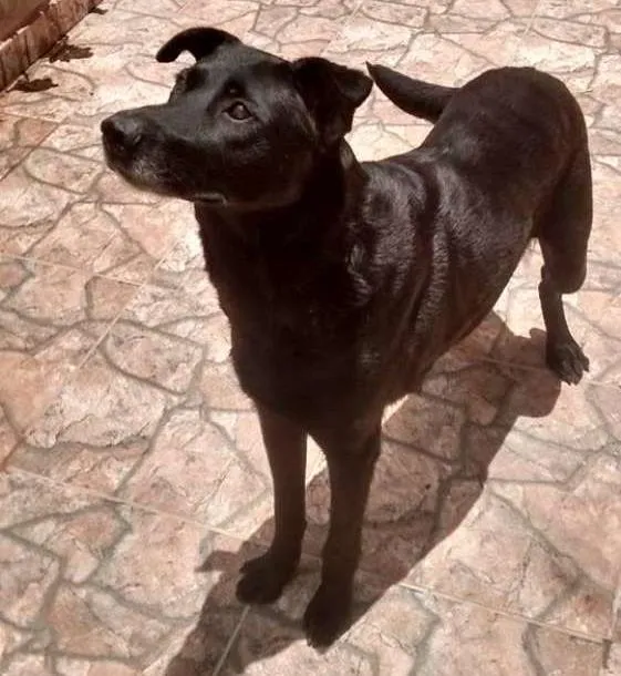 Cadela encontrada com seus filhotes. Ela é dócil, brincalhona, adora pão, não gosta de dividir a comida mas se dá bem com outros animais. Seus pelos são pretos e curtos.