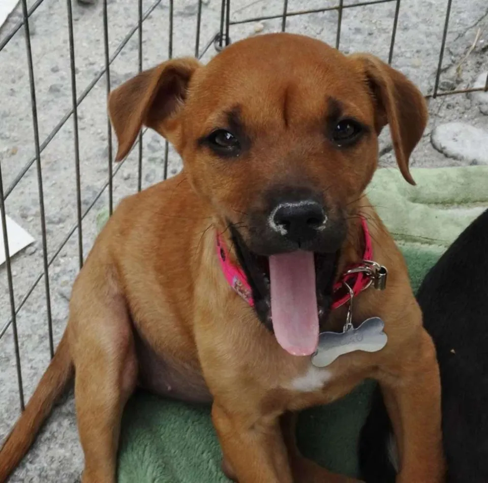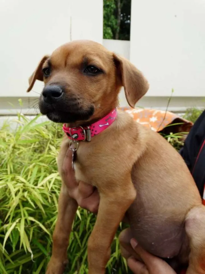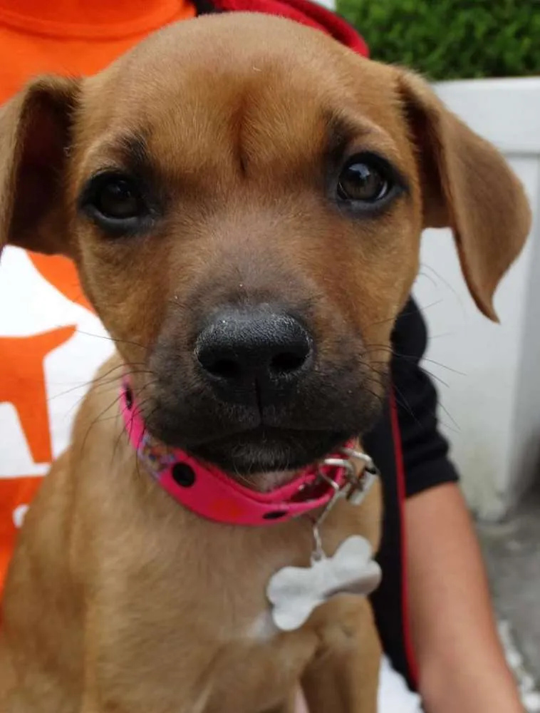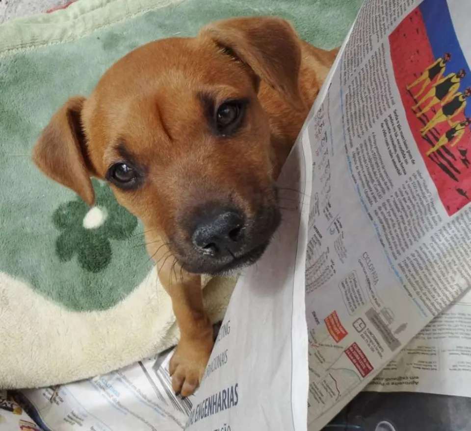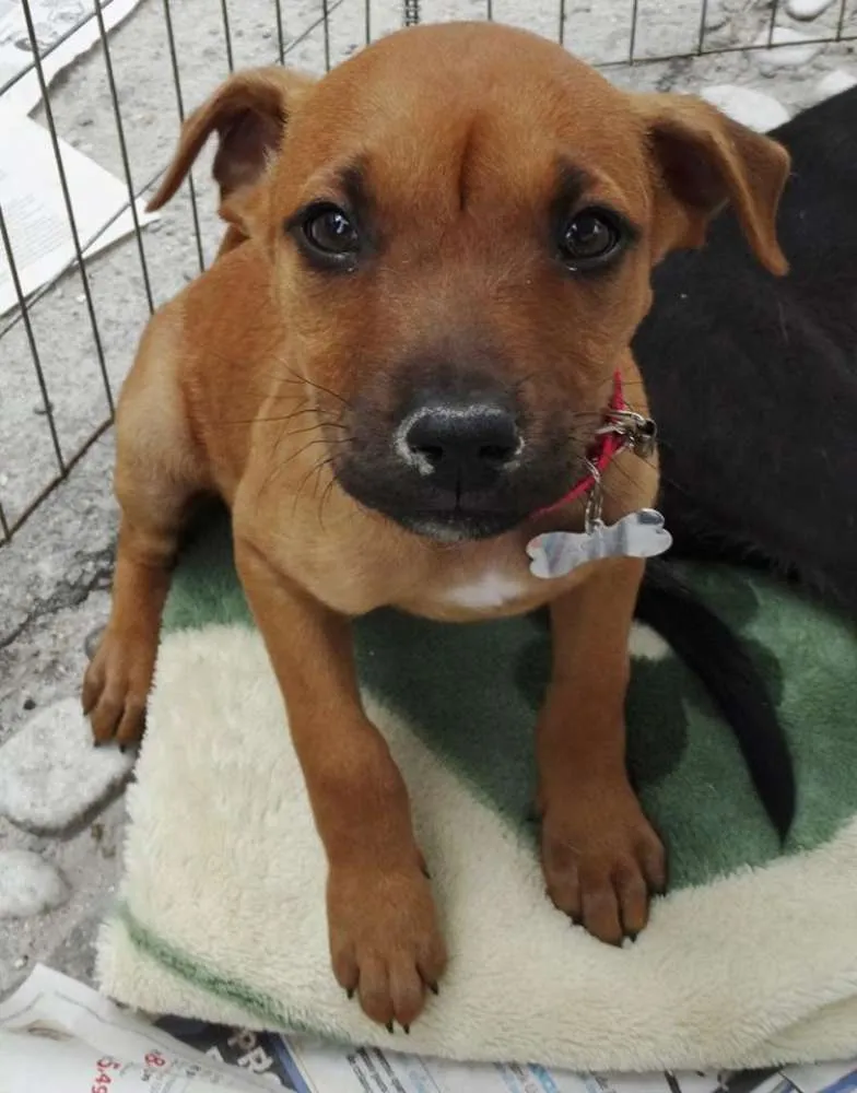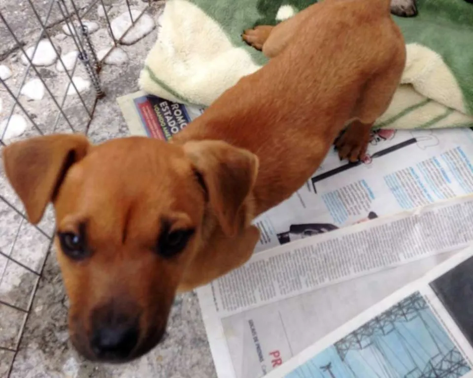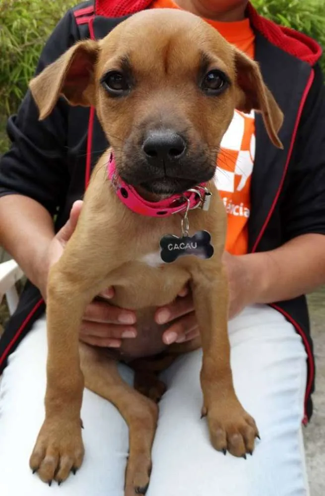 Cacau, fêmea, 2 meses, provável porte médio/ Grande. Está com 1° dose da vacina e só sera doada com compromisso de castração paga e agendada.