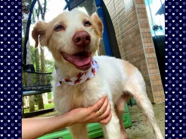 Fábio, dono de lindos olhos azuis, olhar meigo e cativante, foi encontrado jogado no mato, machucado, desnutrido, praticamente sendo devorado por pulgas e carrapatos.