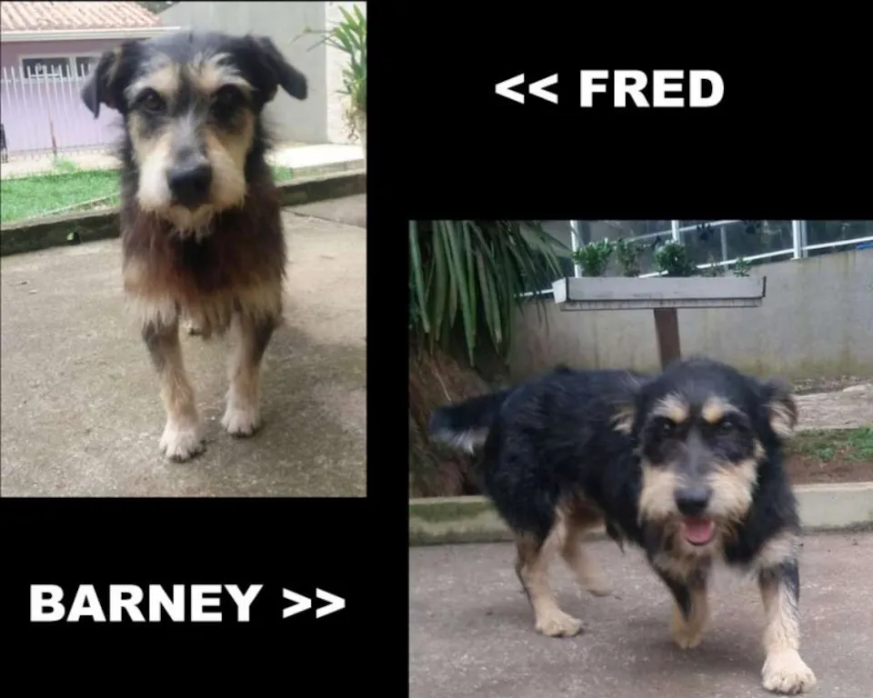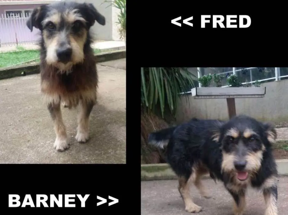 Fred e Barney são dois irmãos. Viviam nas ruas e foram resgatados. A vida de abandono fez com que se tornassem inseparáveis. Então a adoção precisará ser conjunta para não haver mais sofrimento para esses pequenos. Eles tem aprox. 4 anos, já estão castrados e vacinados. O porte é médio, Fred mais alto e Barney mais baixinho. Que tal adotar esta dupla? Uma grande vantagem de adotar dois é que a adaptação normalmente é tranquila. Um está acostumado com o outro, já são companheiros.