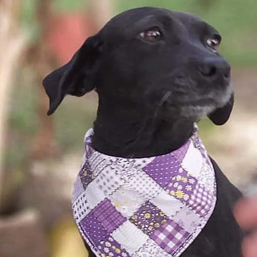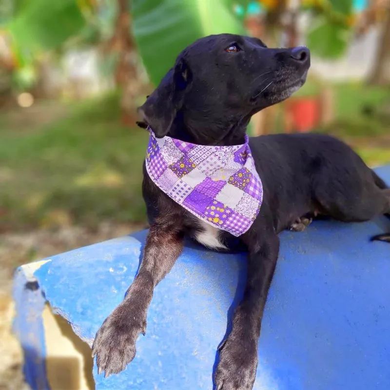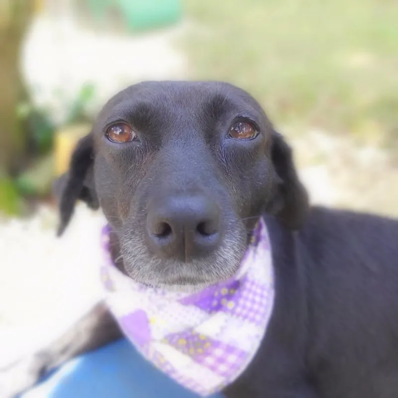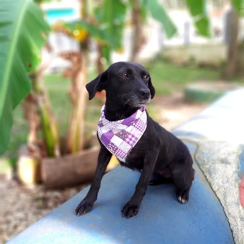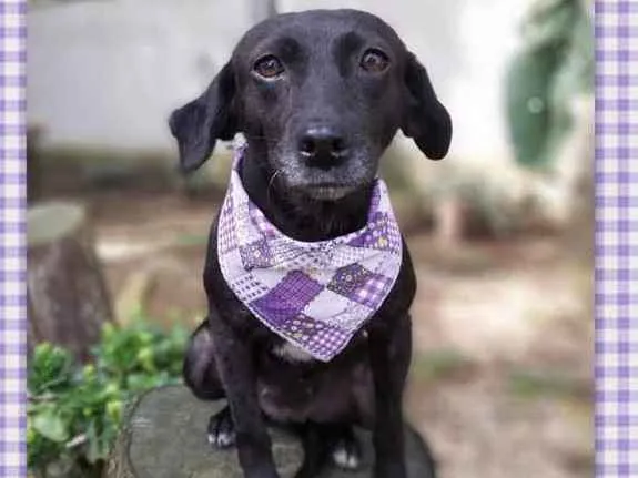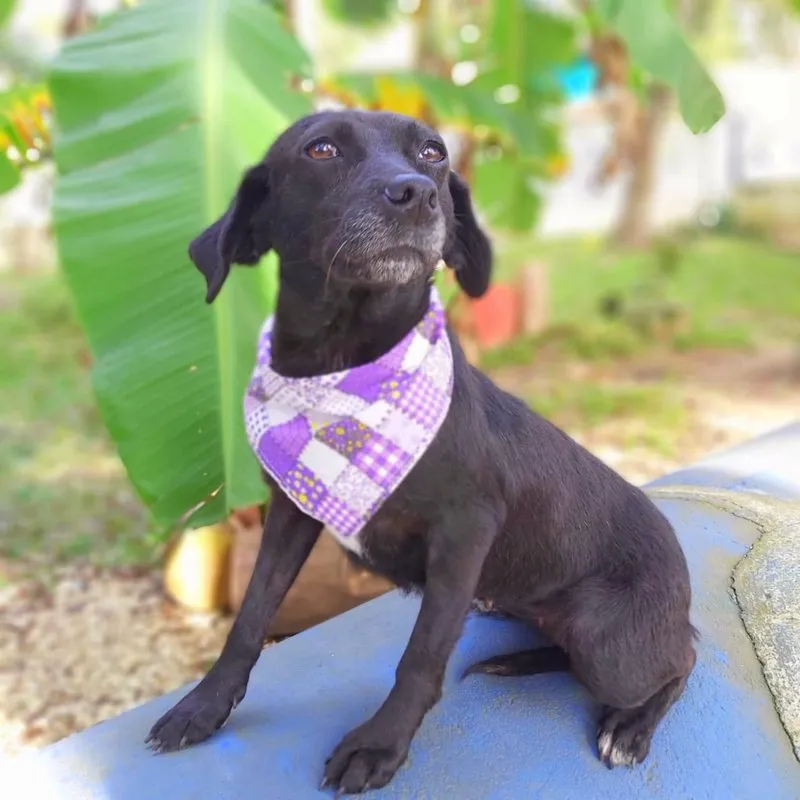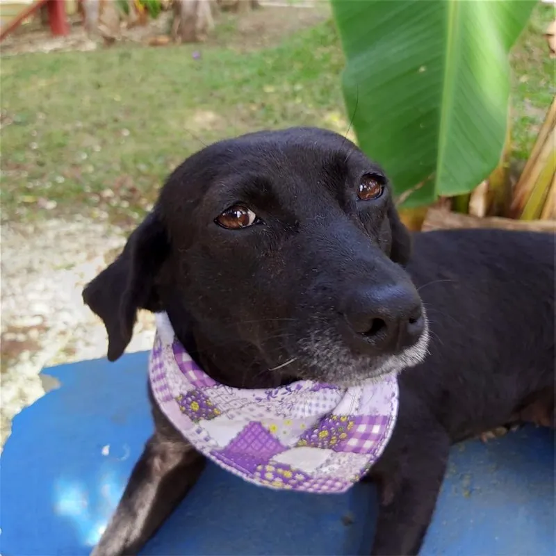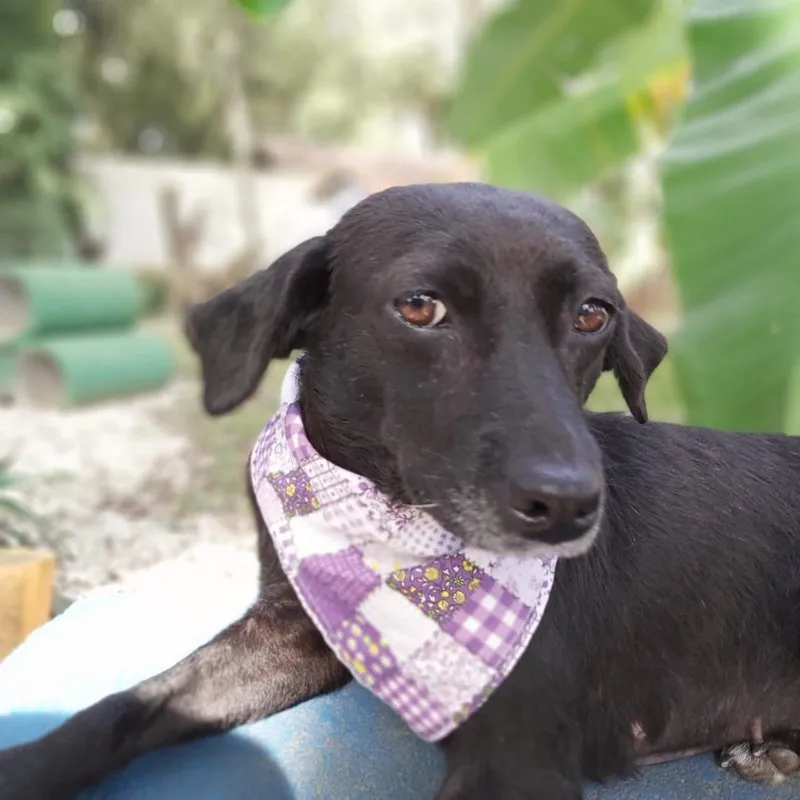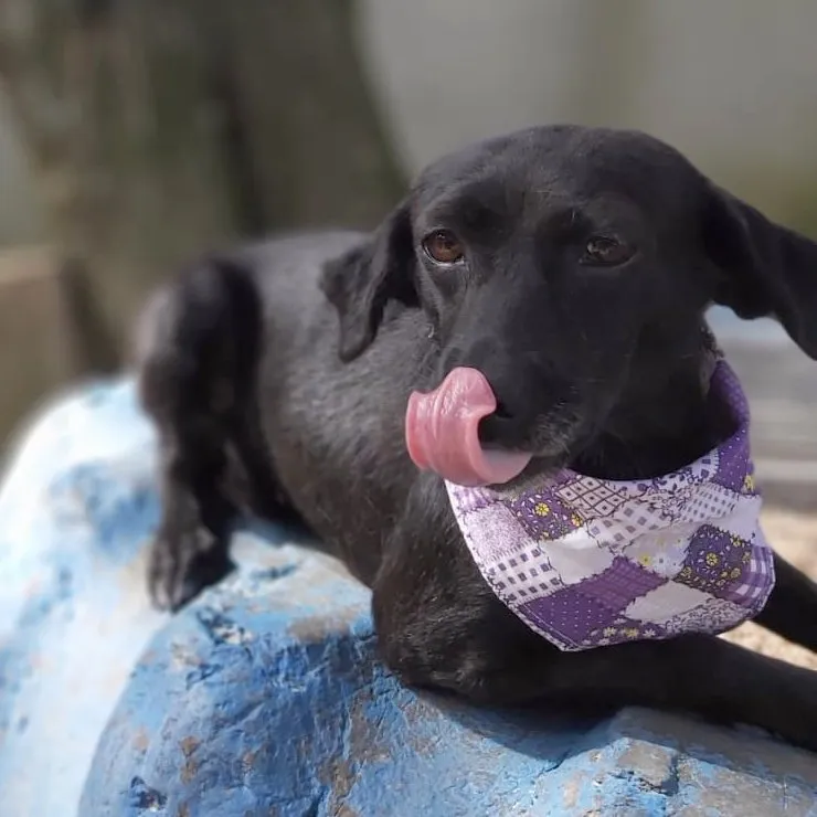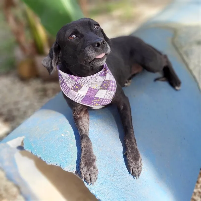 Tem o porte pequeno, deve ter uns 7 ou 8 anos, com energia de menina. Teve a vida, até aqui, marcada por coisas bem ruins, uma das marcas está em sua pele e não vamos tirar nunca. Ela foi quase degolada, não sabemos como e nem como foi salva. Passou por procedimento cirúrgico, teve os ovários separados do útero e tudo ficou lá dentro do seu abdômen e fez piometra. Como se não bastasse, carregava um TVT e sarna. Tudo numa guria com menos de 8 quilos.