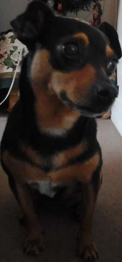 Ola ela foi abandonada dia 22/12 pelos donos, não posso ficar com ela pois já tenho 3 cachorros de porte grande ela é muito boazinha.Pequena de pelo curto preta e marrom.
