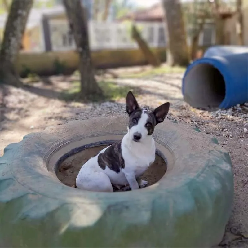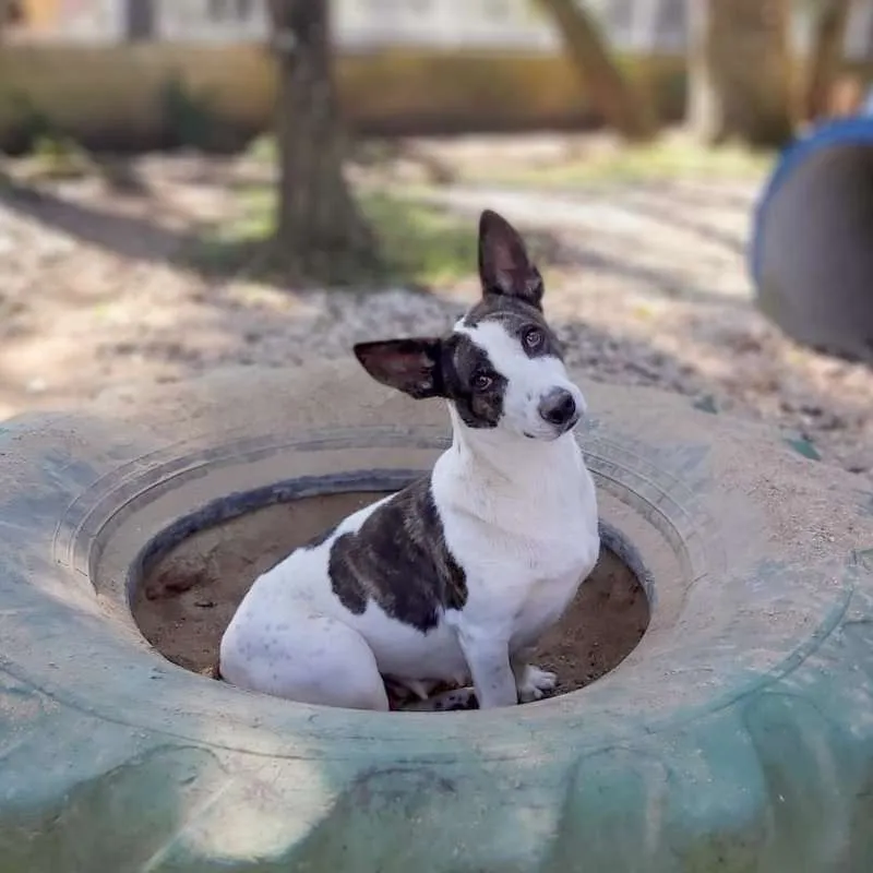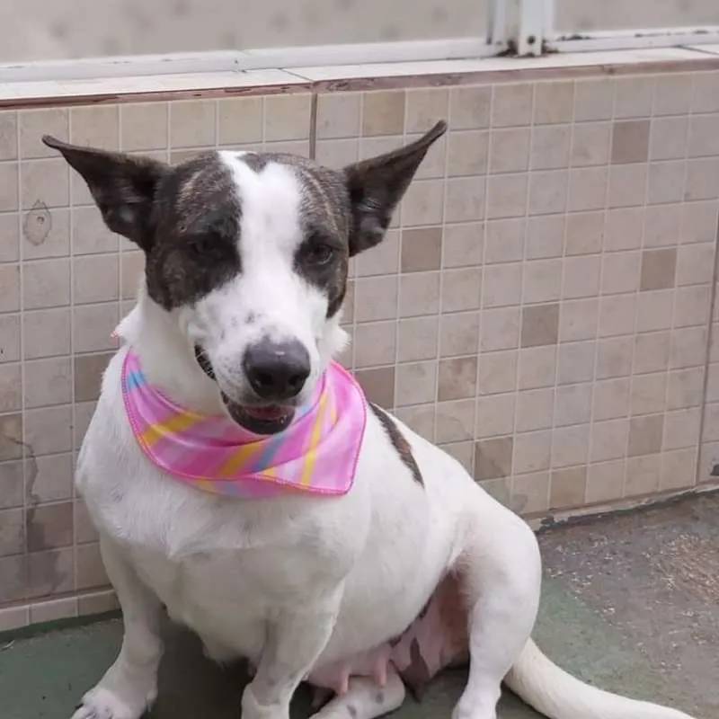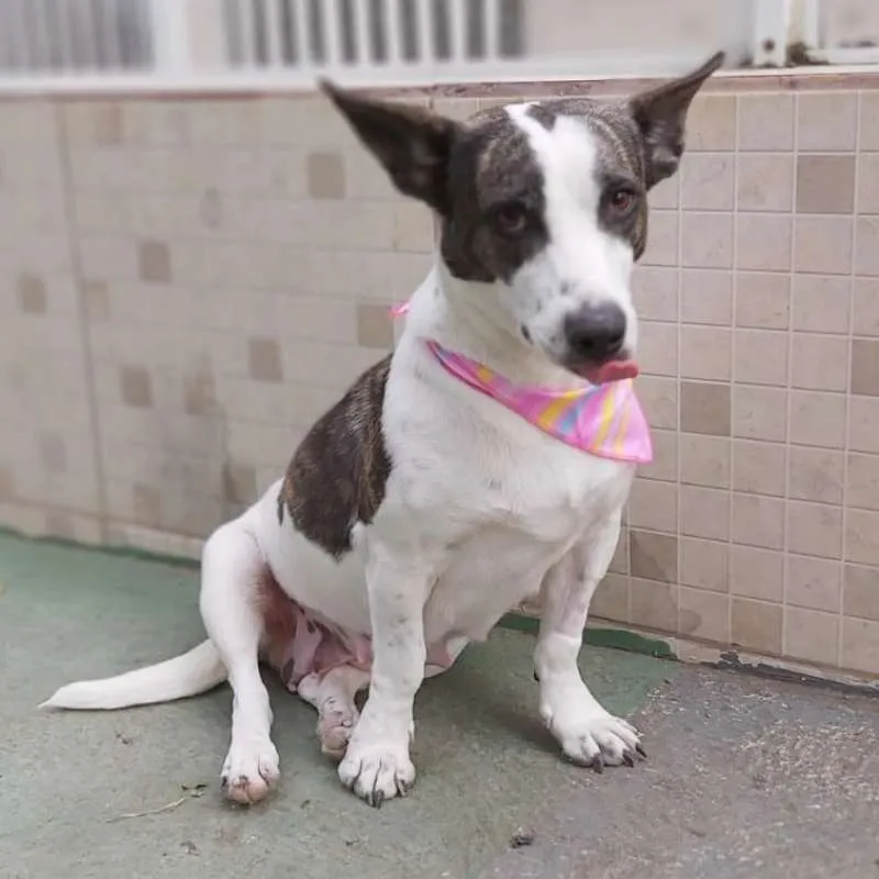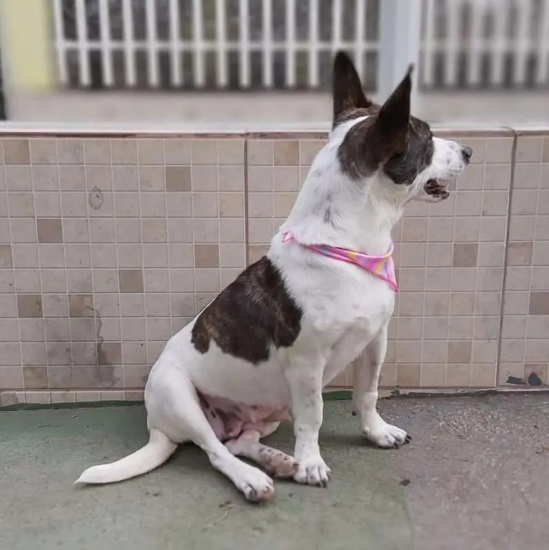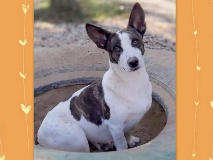 Uma princesa com as orelhas mais lindas!!! Com aproximadamente 2 anos, foi castrada e está com as vacinas programadas. É de porte médio, baixinha, mas é pesada, tem pernas curtas o que faz dela uma guria entroncadinha e rebaixada, tornando-a única. Dócil e tem se relacionado bem com os colegas, com a gente então, nem se fala. Queremos muito uma família especial que lhe proporcione tudo de bom, que não tenha experimentado antes de chegar no abrigo.