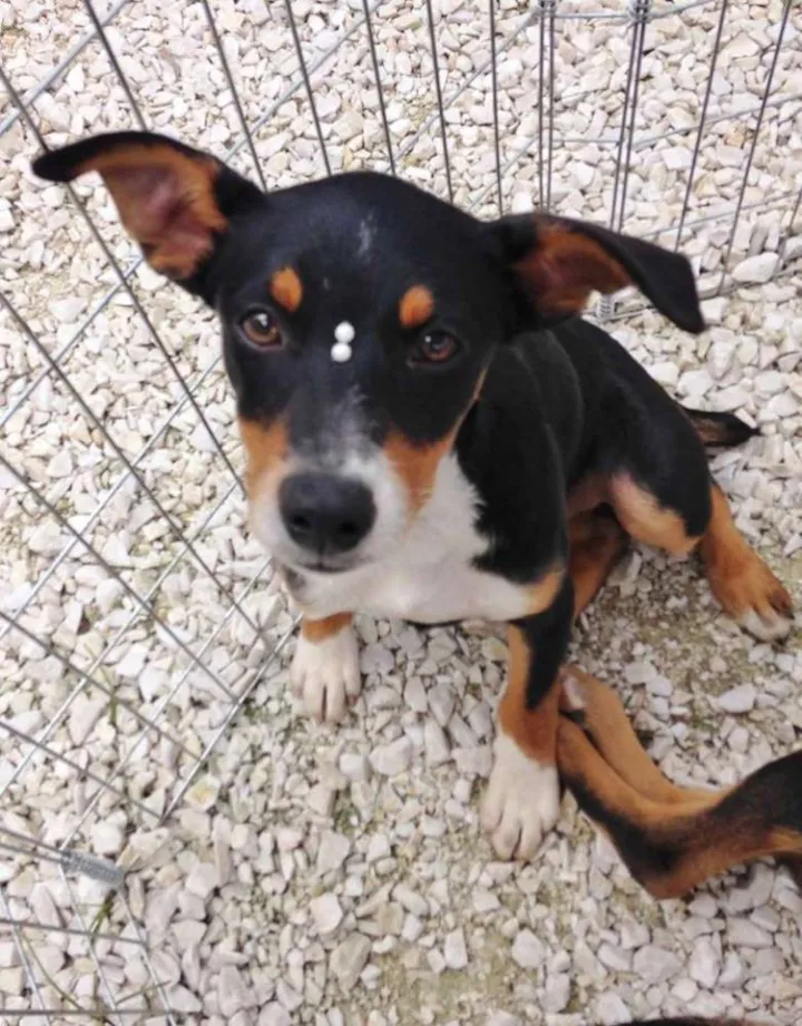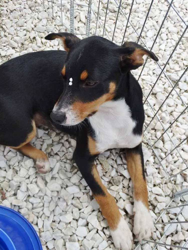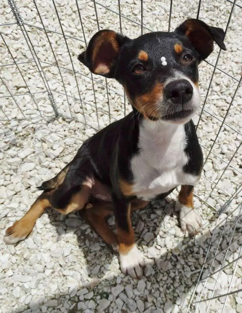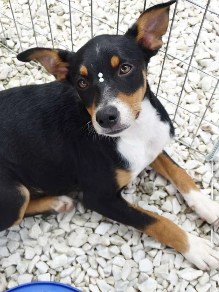 Meg,tem em torno de 5 meses, castrada e com uma dose da vacina. A mãe é porte pequena o pai desconhecido devem ficar porte pequeno/médio.
