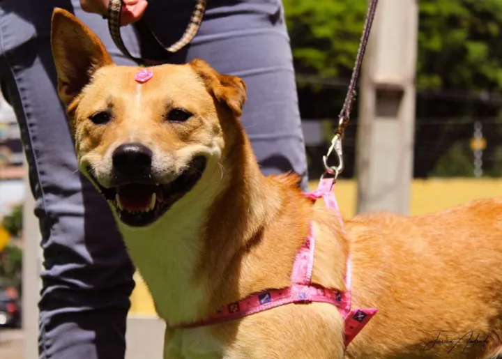 Raposa tem em torno de 2 anos, está castrada e vacinada. Porte médio, dócil, carinhosa, só não gosta de gatos. Fica bem dentro de casa mas dorme em casinha.
