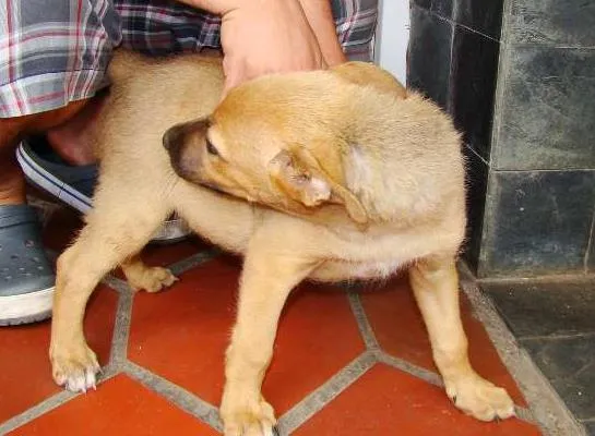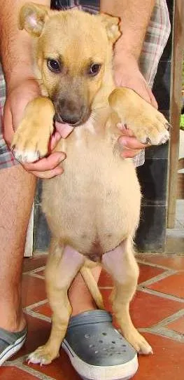 É um machinho, porte médio, deve estar com uns 50 dias bem novinho, adora brincar como todo filhote!!!