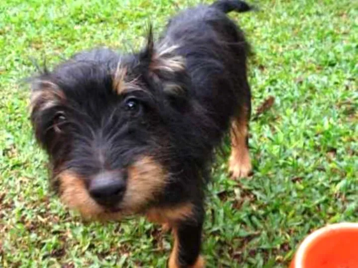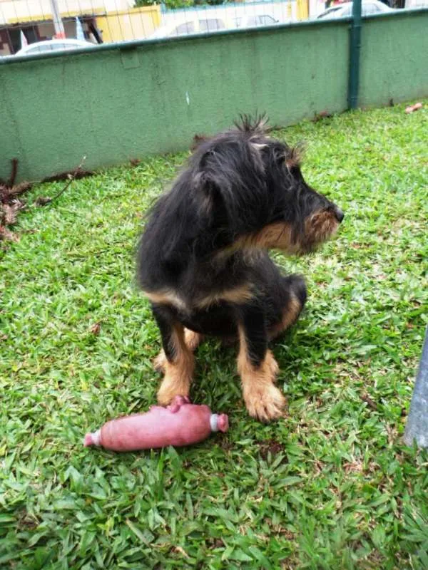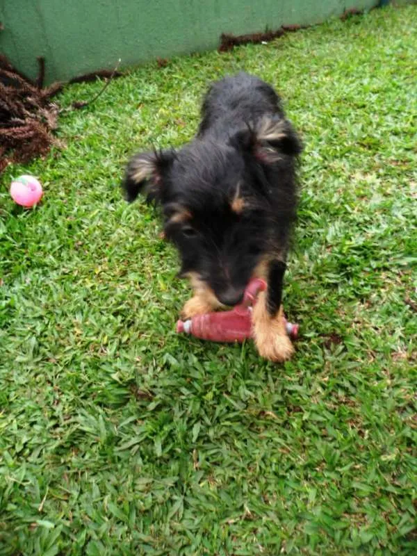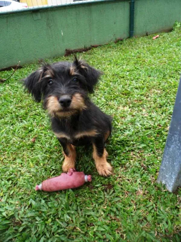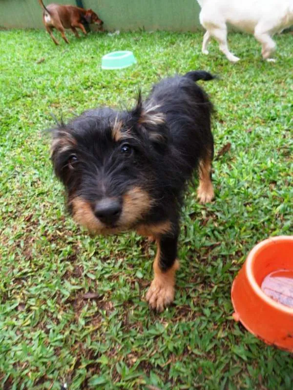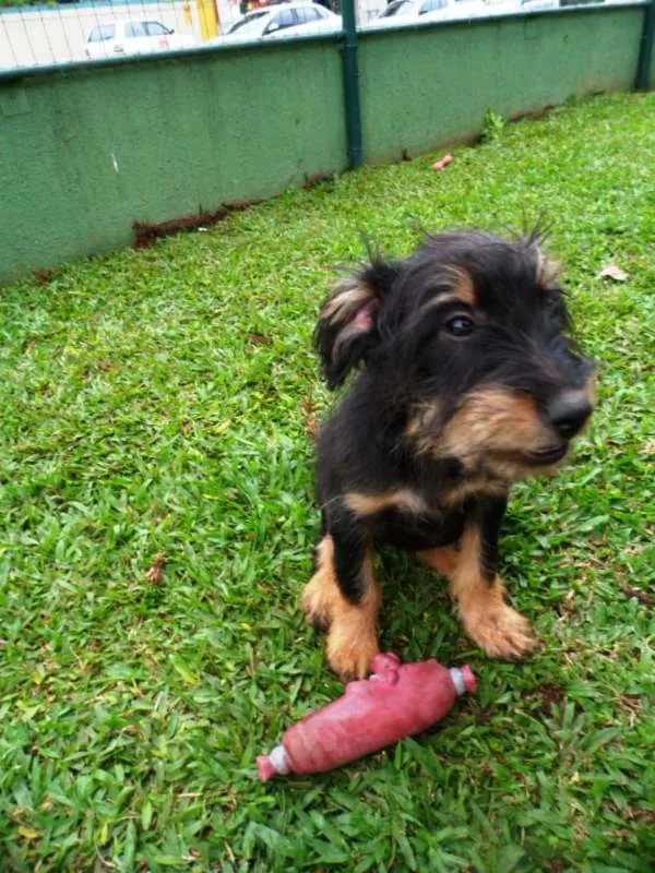 Teo, 4 meses, castrado, está com as 3 doses da vacina, adotante deverá fazer a de raiva com 5 meses. A mãe é porte médio e o pai não conhecemos deve ficar porte médio entre 15 a 18kg.