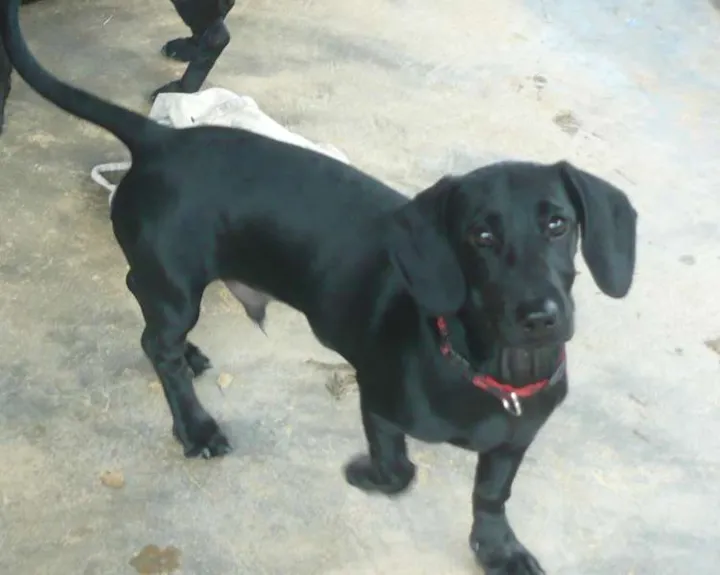 Ele é totalmente preto, com pelo bem curto, e atende pelo nome de Toto. é muito manso e adora crianças.