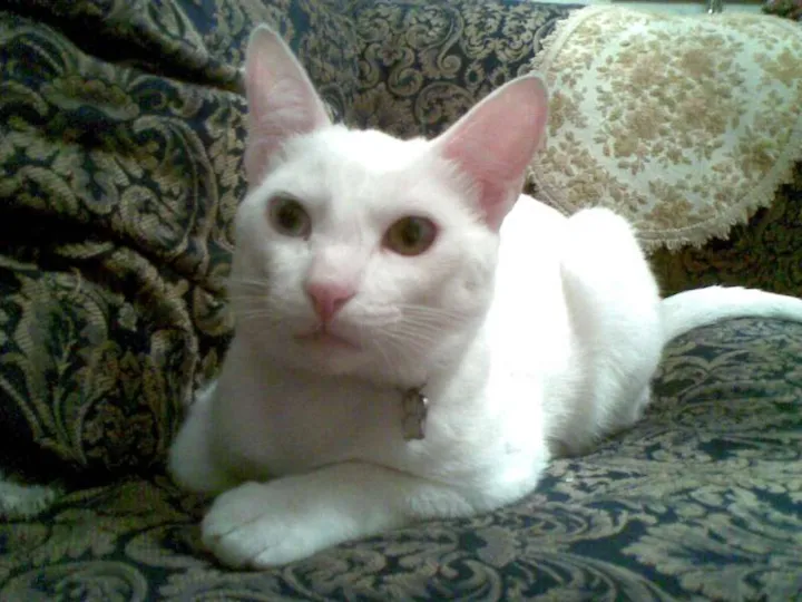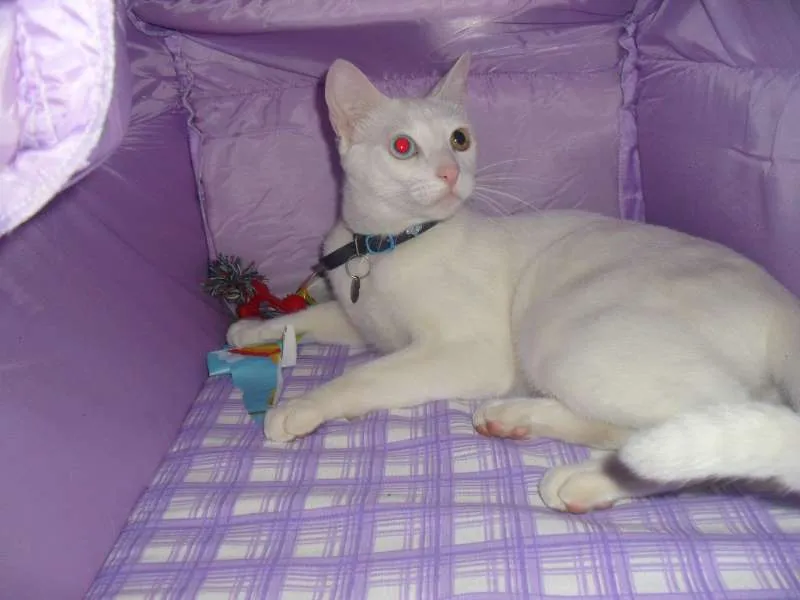 Gato branco, magro, alto, um olho azul e outro amarelo esverdeado. Castrado e extremamente dócil. Foi roubado no bairro bom retiro, pois estava com a coleira e encontramos a coleira no meio da rua, exatamente no local onde foi visto um carro parando e pegando ele.