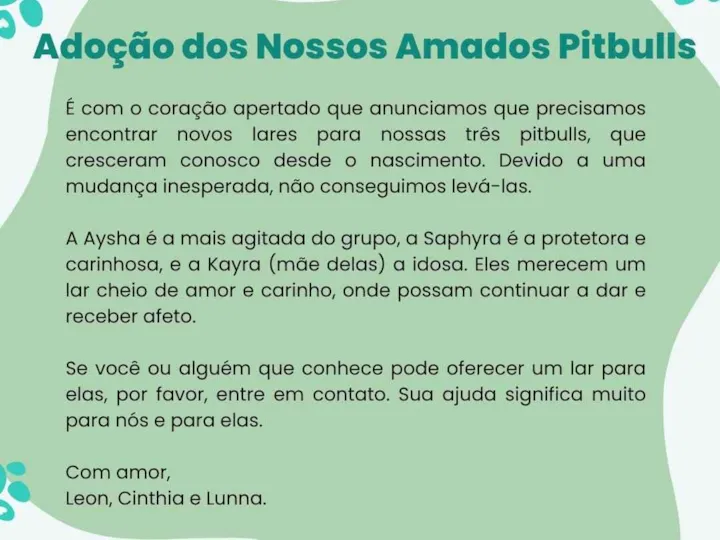 Estamos em busca de um novo lar que possa oferecer a elas todo o
