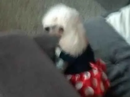 Cadela poddle, branca, pequena, com roupinhas preto e vermelha com bolinhas branca