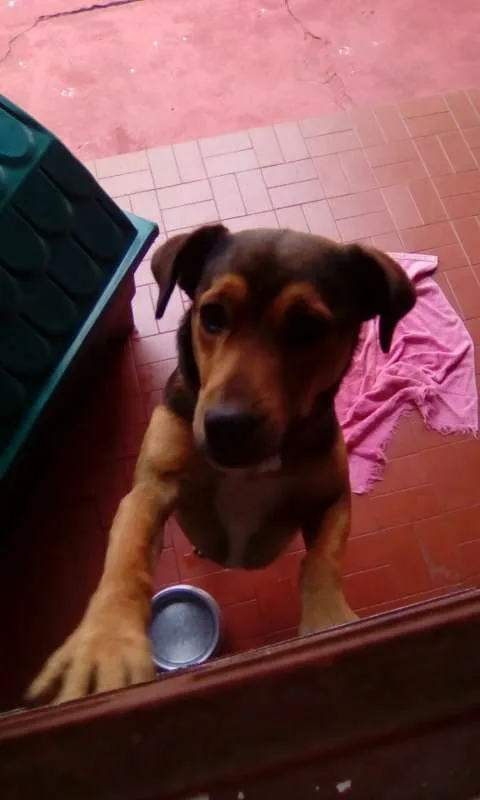Cão sem raça, malhado (caramelo com branco e preto), olhos castanhos, gosta de abraçar pessoas, bom para cuidar do quintal, brinca com brinquedos e ossos, gosta de tomar banho, está com vacinas em dia. Como vou me mudar para apartamento infelizmente não posso levá-lo, pois lá não permitem cachorro de raça média ou grande. Dessa forma, preciso doá-lo.