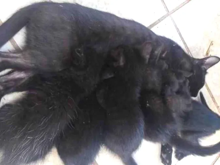Ninhada de gatinhos pretos. Fêmeas e machos. A mãe deles é a Morceguita
