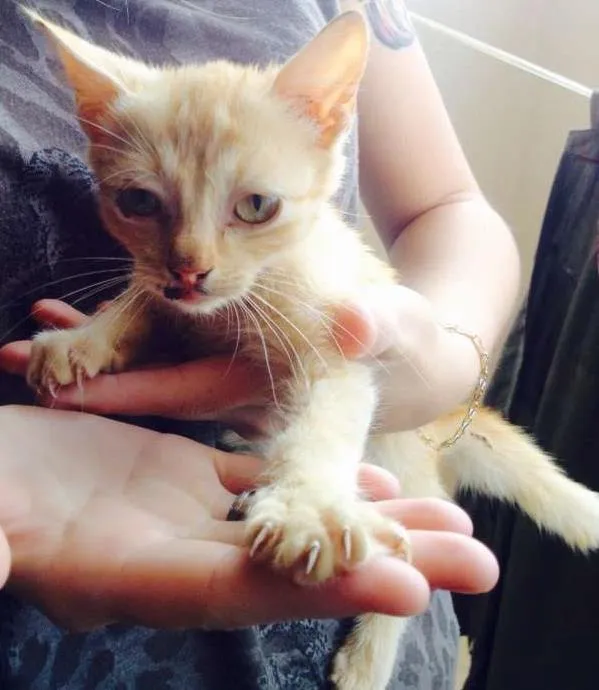 Bom dia, encontrei essa gatinha com menos de 2 meses na porta do meu prédio. Acolhi ela, dei banho e cuidei dela desde ontem, não posso ficar com ela pois ja tenho um gato e um cachorro.