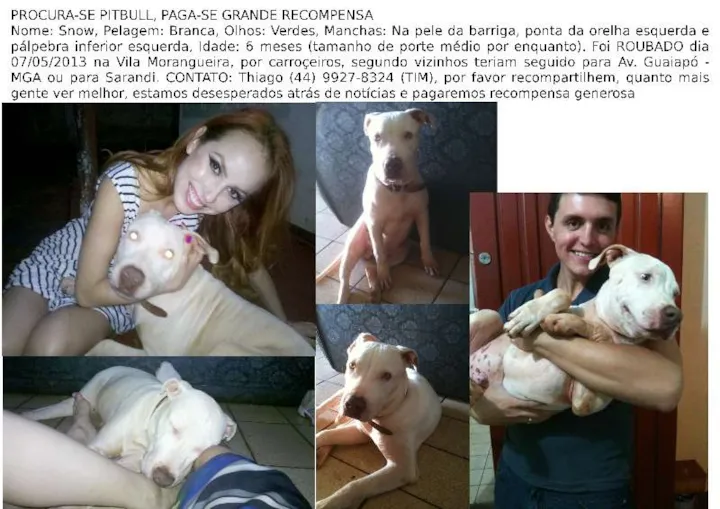 Nome: Snow, Pelagem: Branca, Olhos: Verdes, Manchas: Na pele da barriga, ponta da orelha esquerda e pálpebra inferior esquerda, Idade: 6 meses (tamanho de porte médio por enquanto). Foi ROUBADO dia 07/05/2013 na Vila Morangueira, por carroçeiros, segundo vizinhos teriam seguido para Av. Guaiapó - MGA ou para Sarandi. CONTATO: Thiago (44) 9927-8324 (TIM), por favor recompartilhem, quanto mais gente ver melhor, estamos desesperados atrás de notícias e pagaremos recompensa generosa