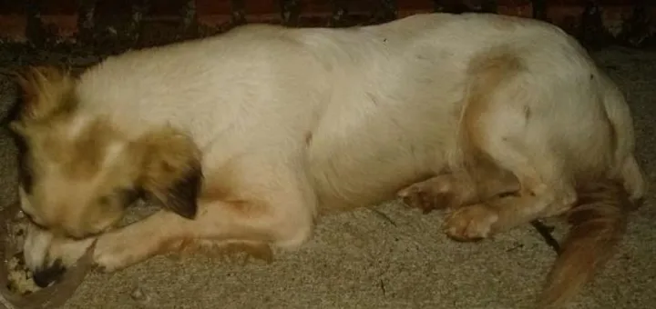 Cachorrinha abandonada no bosque de Paraíso do Norte, extremamente dócil e que vem sofrendo agressões de pessoas desconhecidas na rua. Inteira branca com manchas marrons. Está mancando.