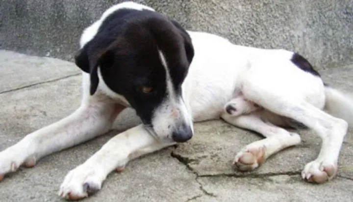 Cadela, dócil, pelo branco com umas malhas em preto, atende pelo nome Laica, natural de Morretes, se assutou quando foi descer da caminhote se soltou da colera e saiu corrrendo pelo porto.