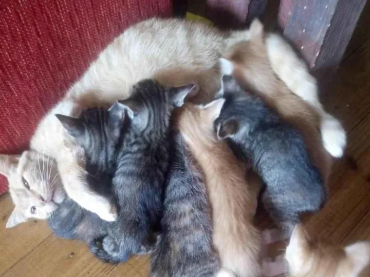 Apareceu uma gata e um gato na minha casa ja fas 3 meses mais nao posso ficar tenho um bebe que tem a doença do gato ... E ela dej cria de 7 gatinhos alguns preto listrados e amarelo com branco