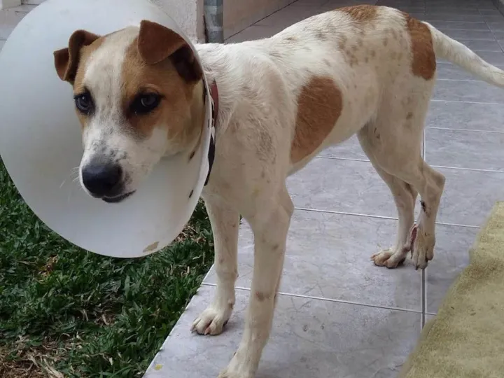 Ele está com um ferimento grande em uma das patas, porém já está sendo medicado (por isso está usando o colar). Todavia, não podemos ficar com ele e devolvê-lo para a rua está fora de cogitação.