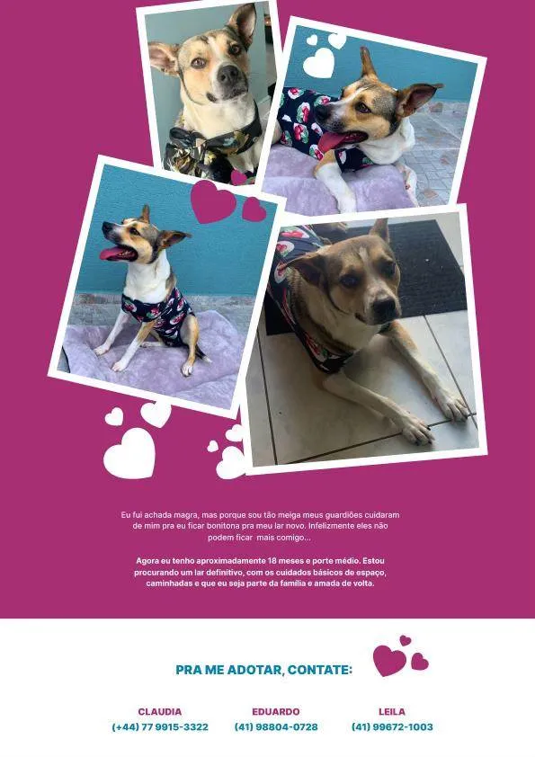 Menina linda, meiga e dócil. Achada magra. Cuidei dela, está linda, castrada e com anti-pulgas e vermífugo em dia. Me comprometo a pagar a vacinação do primeiro ano.