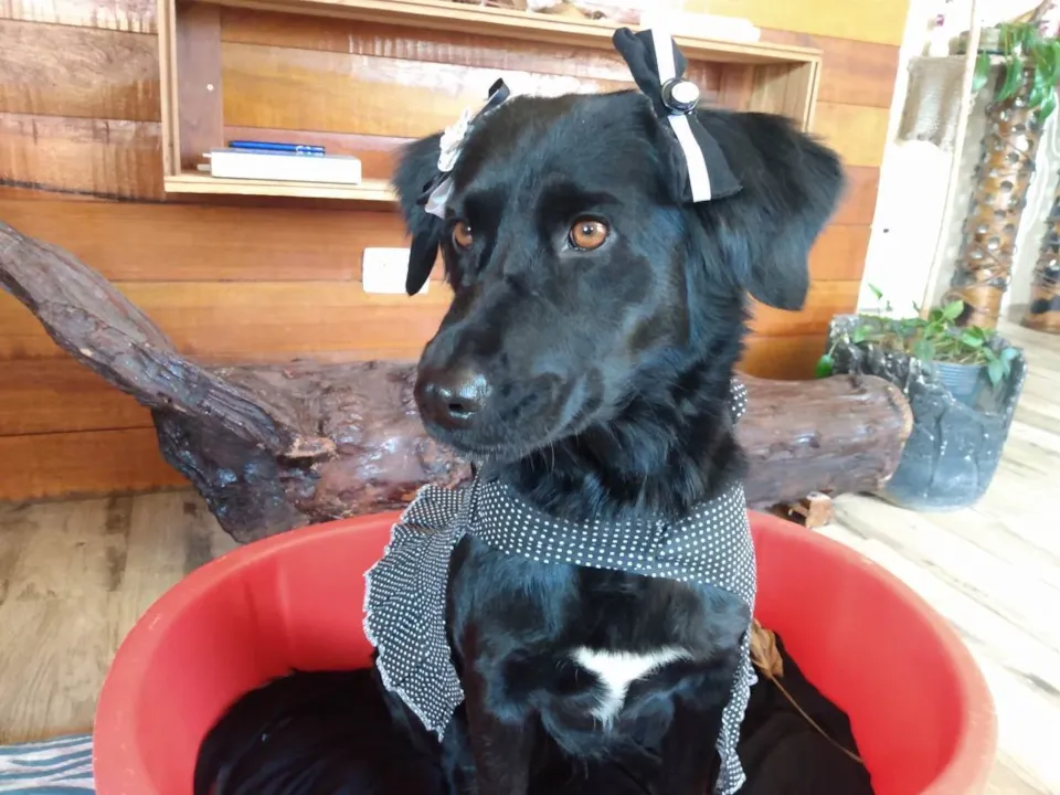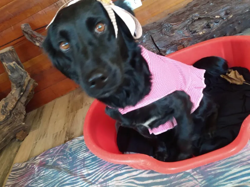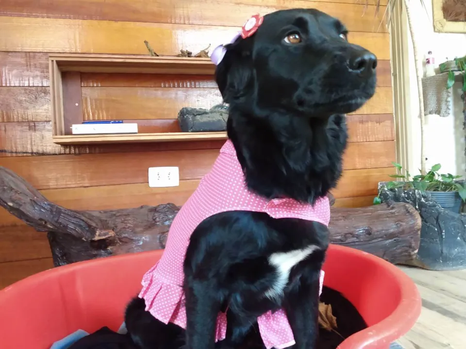 Características Físicas: feminha, mestiça à raça Flat Coat Retriever; cerca de 1 ano de vida; porte médio (25 Kg, em média); pelagem densa, fina, muito macia e lustrosa, com franjas nos membros e em toda a extensão da cauda (coloração padrão); focinho alongado, orelhas em “v”, naturalmente inclinadas; olhos amendoados; trufa negra.